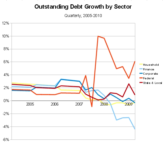 Addendum: Here is another piece of evidence that the so-called recovery is nothing more than an artifact of the massive increase in federal borrowing and spending. Notice how far below the average historical 2% increase the three private sectors have fallen and remember that the Finance sector alone is twice as large as the Federal sector.