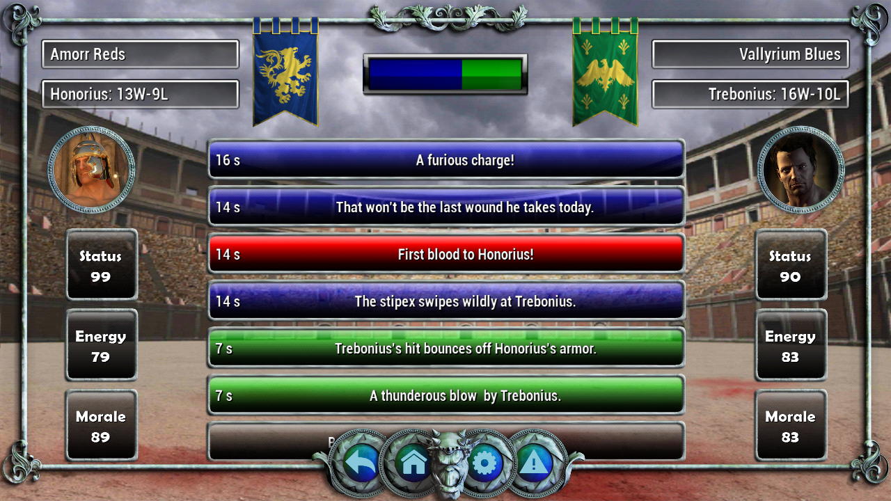 This is a pre-Alpha screenshot of a combat between two equally matched fighters.  There are about 5,000 messages in the commentary system, more than 10x more than the leading game of this type, which allows for a wide variety of complicated narratives in describing the various arena battles.  In this particular screenshot, the stipex, Honorius, has just managed to score a reasonably damaging hit on Trebonius, the hoplomachus.