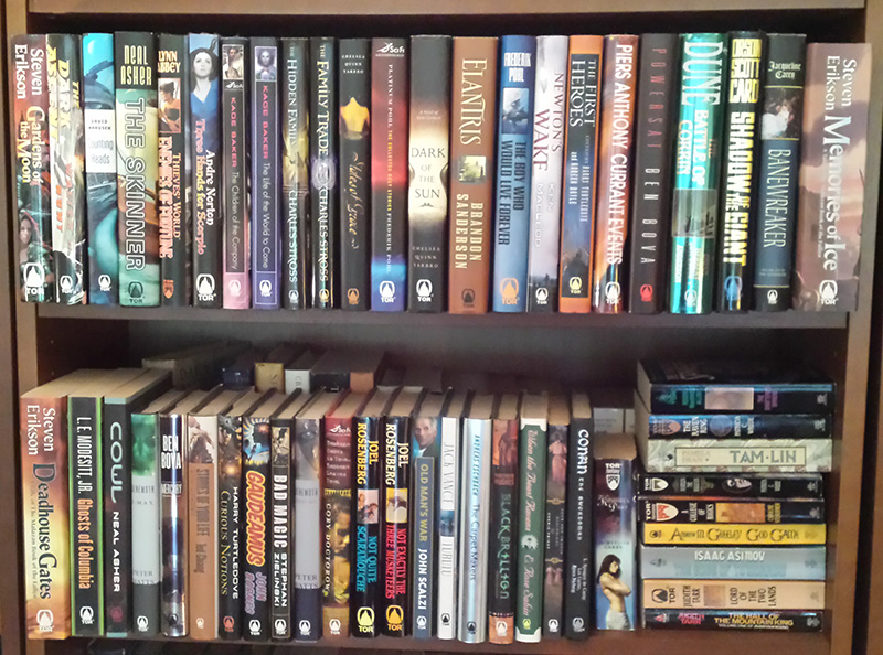 As you can see in the photo to the left, I currently have 38 hardcovers and 15 paperbacks published by Tor Books that retail for a cumulative $1,019.64. Some of them were sent to me by Tor, many of them were bought by me. This does not count any of the Tor ebooks that I have purchased, or any of the many Tor paperbacks I got rid of in a move some years ago, which I recall included at least six Wheel of Time books and a number of Orson Scott Card novels, among others. I figure that I would be wise to not lay claim to have had any books that I cannot prove I presently possess, but I estimate that I have probably spent an additional $500 more on Tor books than I can demonstrate today. As it happens, I have been a Tor Books customer since 1986, when I was still in high school and I bought a copy of Isaac Asimov’s The Edge of Tomorrow from B. Dalton’s. I still have it; you can see it third from the bottom on the right.