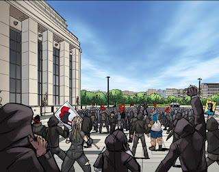 I’m not sure if this is a slightly different perspective or if the artist simply omitted the Eiffel Tower due to its frequent appearance on other pages. But it’s still rather striking, considering the timing. Of course, while I correctly anticipated the gendarmarie opposing the nationalists in The War in Paris, I thought Antifa was going to directly oppose the nationalists rather than try to co-opt their movement.