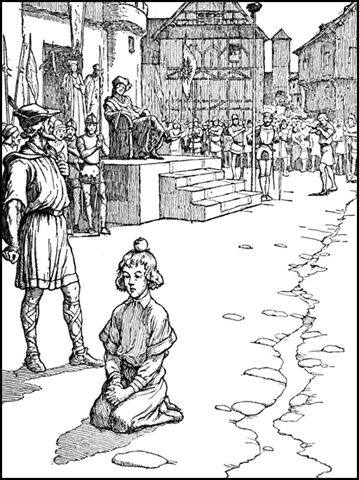 “They tell me you shoot well,” said the tyrant. “You shall not be punished. Instead you shall give me a sign of your skill. Your boy is no doubt made of the same stuff you are. Let him stand yonder a hundred paces off. Place an apple on his head, and do you stand here and pierce the apple with an arrow from your quiver.”