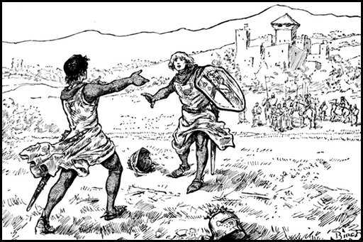 Scarcely pausing a moment, they rushed upon one another, each striving to throw his adversary to the ground, and failing in that, each snatched at the other’s helmet to tear it away. Both succeeded, and at the same moment they stood bareheaded face to face, and Roland recognized Oliver, and Oliver, Roland. For a moment they stood still, and the next, with open arms, rushed into one another’s embrace.