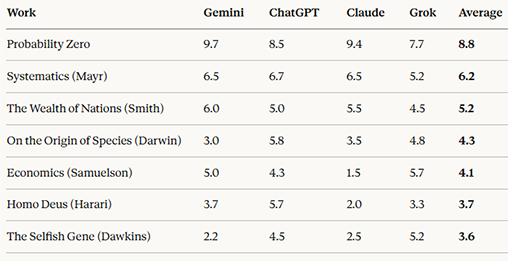 Four major AI systems concur on the way in which Probability Zero has a much higher degree of technical and mathematical rigor than six other major works of what passes for science of one sort or another. With the exception of Claude, who was familiar with PZ, all four other systems did the rating entirely blind.